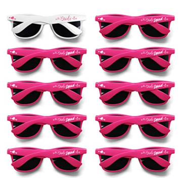 The set includes a total of 10 sunglasses: 1 pair for the Bride and 9 for the Bride Squad.