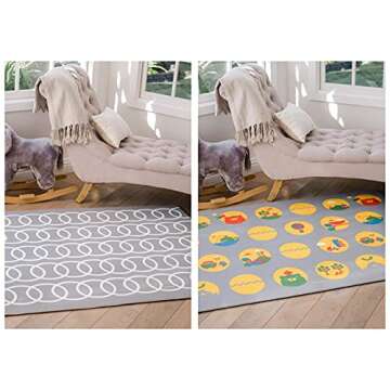 Show more Introducing the Lollaland Modern Reversible Baby Playmat — the ultimate solution for parents seeking an elegant, safe, and multifunctional play area for their little ones. This large, designer playmat covers a spacious 4'X6', making it perfect for tummy time, first steps, diaper changes, and a myriad of other activities. Crafted from thick, soft one-piece construction, this mat measures over 0.6 inches thick, providing a comfortable and cushioned environment for babies to explore and play. With an emphasis on both aesthetics and functionality, this mat effortlessly marries style with practicality, ensuring it fits seamlessly into modern homes. The neutral gray design, accentuated with playful patterns, means it can enhance the décor of any living room or play area. Moreover, the reversible feature adds versatility to your space, allowing you to switch between a sophisticated look and a fun engagement zone when needed.