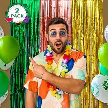 LOLStar Hawaiian Luau Party Decorations, 2Pack Green Brown and Yellow Foil Fringe Curtains