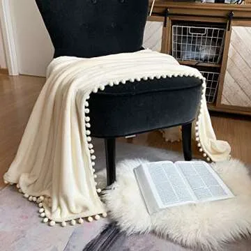 LOMAO Flannel Blanket with Pompom Fringe Lightweight Cozy Bed Blanket Soft Throw Blanket fit Couch Sofa Suitable for All Season(Ivory, 51''x 63'')