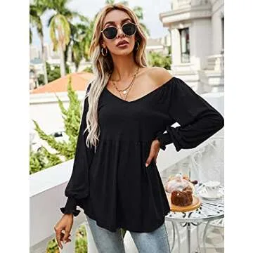 LOMON Black Cold Shoulder Tops for Women Puff Sleeved V Neck Pleated Tunic Tee Shirts, M