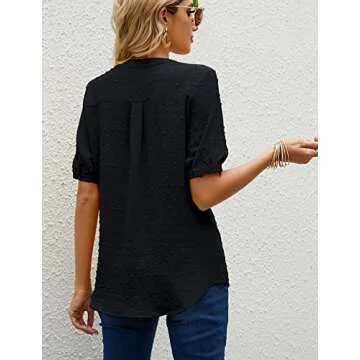 LOMON Womans V Neck Blouses Pom Pom Puff Short Sleeve Button Shirt Tops Classic Fit Spring Workwear Black L