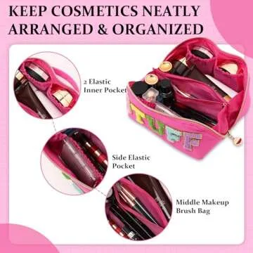 LONEDREAM Stoney Clover Preppy Makeup Bag, Large Capacity Travel Cosmetic Bag, Chenille Letter Open Flat Nylon Stuff, Preppy Patch Better Belt Everything Makeup Bag, Rose Red