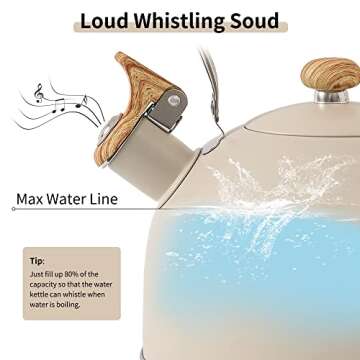 The teapot features a loud whistling sound that alerts you when the water has boiled, so you never have to worry about forgetting it on the stove. It's engineered to function perfectly as long as the water level stays below the outlet, ensuring the whistle operates correctly every time. You can confidently step away knowing that a pleasant whistle will remind you when it's time to pour.