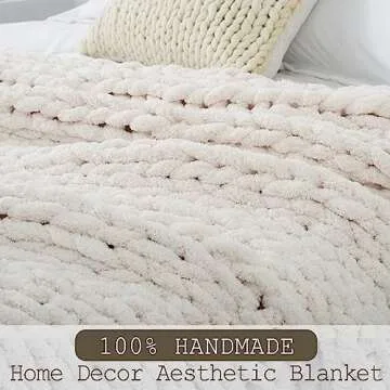 LONG CREATE Chunky Knit Throw Blanket 50"X 60", 100% Handmade Chenille Yarn, Thick Cable Knit, Cream White