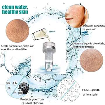 Show more Transform your daily routine with our advanced bathroom faucet water filter, designed to provide you with cleaner and softer water for a truly refreshing experience. This innovative product effectively purifies water as it flows through its multi-layer filtration system, ensuring that you enjoy safe and smooth water at your fingertips. Featuring a unique combination of KDF-55, Vitamin C Balls, PP Cotton, and 100% Coconut Shell Activated Carbon, this filter captures sediments and eliminates chlorine and harsh materials that can be detrimental to your skin.