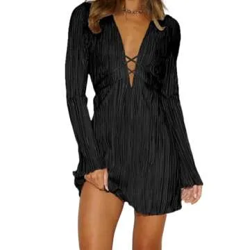 Show more Look effortlessly sensational all through the night with the Lancifolium Pleated Satin Flare Long Sleeve Mini Dress! This exquisite piece is crafted from high-quality satin that feels as luxurious as it looks. The dress features a stunning plunging neckline and elegant long sleeves that exude sophistication. The flared sleeves add a touch of drama, while the delicate ruffle hem enhances its feminine charm. Designed to be both flattering and functional, the criss-cross belt tie waist allows for customizable sizing that accentuates your figure.
