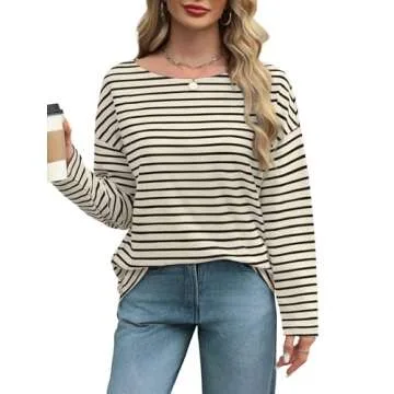 Long Sleeve Shirts for Women Tunics Boat Neck Top Black and White Striped Shirt Batwing Tops Casual Loose Fit T-Shirt M