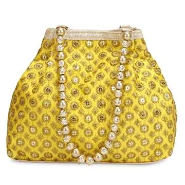 Introducing the LONGING TO BUY Women's Potli Bags & Wristlets Clutch for Wedding – a stunning accessory that combines tradition with contemporary style. This exquisite potli bag is crafted from premium embroidered silk, offering an elegant texture and vibrant yellow hue that is perfect for various occasions. Weighing next to nothing, it wraps comfortably around your wrist while making a bold statement with its beautiful pearl handle. A spacious compartment makes it easy to store your essentials—your...