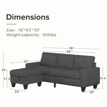 Lonkwa 78'' Convertible Sectional Sofa Couch, Dark Grey 3 Seat L-Shaped Couch with Storage Ottoman, Modern Linen Fabric Couches for Living Room, Apartment, Office, Small Space