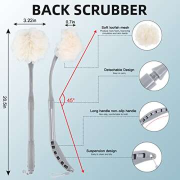 Show moreExperience the ultimate in self-care with the Loofah on a Stick, a 20.5-inch shower sponge designed to enhance your bathing rituals. Crafted from high-quality soft PE material, this loofah back scrubber combines an ultra-fine and soft mesh that generates rich lather with minimal body wash. It easily removes dirt, dead skin, excess oil, and residue, offering a refreshing cleanse that leaves your skin feeling softer and smoother than ever before. Not only does it provide a deep clean, but it also stimulates blood circulation and aids in detoxification, making your daily shower more revitalizing.