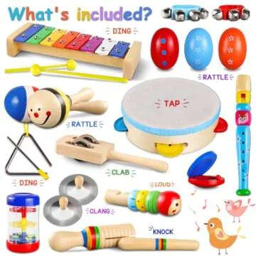 Show more The perfect gift for budding musicians, this baby musical toy set transforms playtime into a harmonious adventure. Designed with little hands in mind, this collection includes an engaging array of instruments: 2 cute baby rattles, a delightful kids' xylophone, a triangle, a pair of cymbals, a wooden cymbal, a lovely whistle, wooden sound sticks, a rain maker, and even 4 maracas shaped like Easter eggs. Each piece is expertly crafted to introduce children to the joys of music, making it an exceptional choice for a preschool gift or Christmas present.