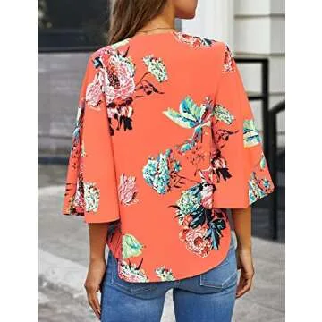 LookbookStore Women Summer Tops Salmon Floral Printed V Neck Button Down Shirts Casual Tie Knot 3/4 Bell Sleeve Loose Blouse Tops Size L