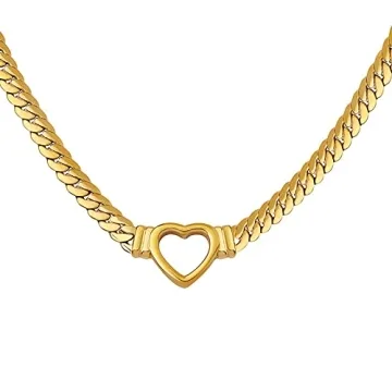 Loqimu Flat Cuban Link Chunky Chain Necklace - Gold Stainless Steel Heart Charm Choker for Women & Teens