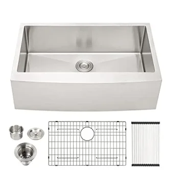 Show moreIntroducing the Lordear 33 Inch Farmhouse Kitchen Sink, a premium addition to any kitchen that marries style with function. Crafted from T304 16 Gauge stainless steel, this sink guarantees durability and longevity, seamlessly resistant to rust, stains, and wear. With its striking brushed finish, the Lordear sink adds a modern elegance to your kitchen space while ensuring scratch resistance for everyday use. The generous dimensions of 33×21×10 inches provide a single-bowl design ideal for handling large pots, pans, and all of your kitchen needs. Plus, its thoughtful R10 radius corner design makes cleaning a breeze and prevents build-up of grime in hard-to-reach areas.
