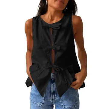 Lordree Women Tie Front Tank Top Sleeveless Ruffled Hem Peplum Top Cute Bow Tie Babydoll Vest Top Summer Streetwear Black