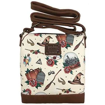 Show more Unleash your inner wizard with the Loungefly x Harry Potter Tattoo All-Over Print Passport Crossbody Bag. This enchanting accessory combines style and fandom effortlessly, giving you a unique bag that showcases your love for the Harry Potter universe. Crafted from high-quality materials, the all-over print features iconic tattoo-style designs that celebrate beloved characters and symbols from the series. The versatile brown multi-color palette ensures that it complements any outfit, making it your go-to bag for magic-inspired outings.