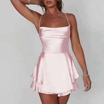 LouVasabuce Women Sexy Backless Short Romper Satin Dress Cowl Neck Tie Ruffle Layer Spaghetti Strap Jumpsuit Mini Dress (Pink, M)