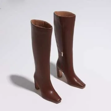 Lovee Cosee Brown Leather Boots for Women Knee High Tall Boots for Women Square Toe Chunky Heels Gogo Boots Wide Calf Block Heeled Fall Boots Dress Sexy Fashion Trendy Wintern Boots Size 8