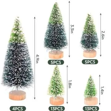 Each tree in this delightful collection is covered with a blanket of artificial snow, adding a natural and peaceful ambiance to your home. With a variety of sizes to choose from, you're free to create stunning displays that fit perfectly into any container or setting. The assortment includes trees that measure 4.9 inches (4pcs), 3.3 inches (5pcs), 2.6 inches (5pcs) in dichromatic colors, as well as 1.8 inches (13pcs) and 1.4 inches (13pcs) in a single color. This versatile range allows for creative decoration possibilities for all occasions.