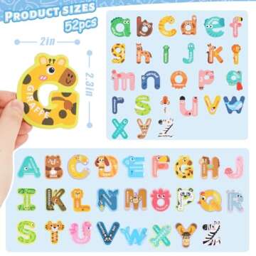 Show more Introducing the LOVESTOWN 52PCS Large Magnetic Letters, a delightful and educational set designed to make learning the alphabet both fun and engaging for young children. Featuring an enchanting assortment of uppercase and lowercase letters, each letter is adorned with a corresponding adorable animal design, like 'D for Dog' and 'C for Cat', capturing children's imaginations and sparking their curiosity as they interact with each piece. Perfect for early learners, these magnetic letters serve as a versatile tool for alphabet learning, letter recognition, and animal awareness, making education come alive in an entertaining way.
