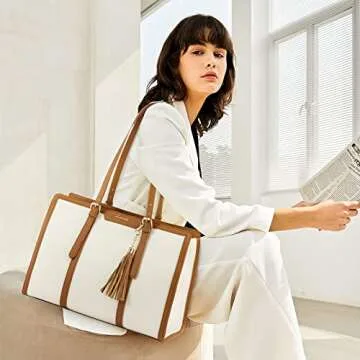 LOVEVOOK Laptop Bag for Women - 15.6 inch Lightweight Canvas Laptop Tote, Large Capacity Computer Bag with Clutch Purse for Business, Work, Travel, School, Casual Beige