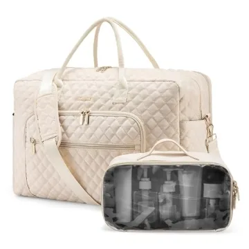 Show more The LOVEVOOK Travel Duffle Bag is the ultimate companion for the modern woman on the move. Designed with both style and functionality in mind, this bag features a separate padded laptop compartment to keep your electronic devices safe, a transparent toiletry bag, and a shoe bag for easy organization. Made from high-density water-resistant material, it includes a wet pocket to separate dry and wet items, making it perfect for gym sessions or unexpected rain showers. With dimensions of 20.5 x 8.4 x 13.4 inches and weighing just 2.7Lbs, it meets most international carry-on requirements, fitting effortlessly in overhead compartments or under seats. The integrated trolley sleeve allows for easy attachment to rolling luggage, making airport travel a breeze. With 15 pockets, including a main compartment, front organized compartment, and side pockets, this bag offers ample space for 3-5 days of essentials, ensuring you stay organized and stylish wherever you go.