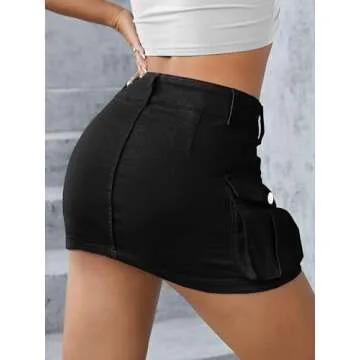 Low Waist Cargo Skirt Women Button Mini Cargo Denim Skirt with Pocket Mini Skirt Black