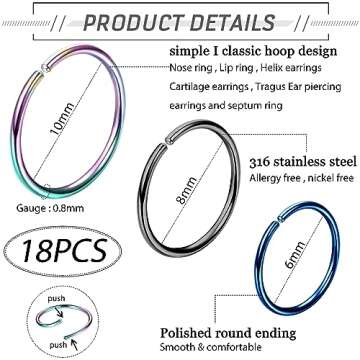 Discover the versatile charm of the LOYALLOOK 18-24 Pcs 20G 316L Stainless Steel Nose Ring Hoops. This stunning set offers a delightful mix of sizes and colors that caters to every individual's unique style. Crafted from premium 316L surgical stainless steel, these nose hoops are not only hypoallergenic but also built to last, ensuring you can enjoy them without any irritation.
