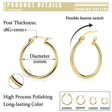 Show more Introducing the exquisite LOYALLOOK Gold Hoop Earrings, designed with sensitivity and style in mind. Crafted from high-quality 316L stainless steel, these earrings boast a stunning high polished finish that not only enhances their aesthetic appeal but also ensures longevity and durability. Perfectly suited for those with sensitive skin, these hypoallergenic earrings are lead-free and cadmium-free, making them safe for even the most delicate ears. The thoughtful design includes a secure clasp which keeps the earrings in place throughout your daily activities while ensuring they’re a breeze to put on and take off.