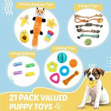 Show more Introducing the ultimate Super Fun Luxury Puppy Toy Bundle, a delightful collection of 21 adorable toys tailored specifically for your playful pups. This set includes 5 squeaky fun toys, 6 new rubber toys, 6 sturdy rope toys, and two bonus rolls of poops bags, ensuring you receive exceptional value for your money. Each toy has been carefully crafted to engage your dog's natural instincts for play and fun.