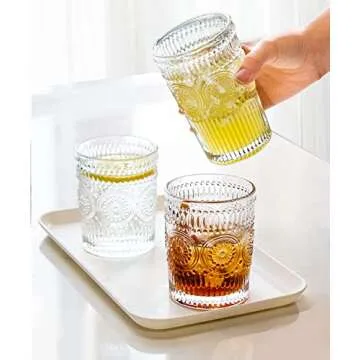 Show more Introducing the LOYUYU Set of 4 Romantic Water Glasses, the perfect blend of elegance and functionality for your drinkware collection. Crafted from durable, heavy glass that is lead-free, these glasses ensure a healthy choice for daily use while adding a touch of vintage charm to your home. The unique Victorian-inspired design features an embossed pattern that not only offers a textured feel in hand but also enhances the aesthetic appeal of any dining setting, whether casual or formal.