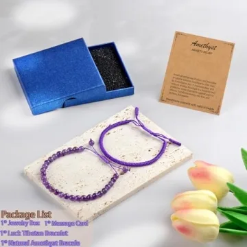 Show moreThe **LPBeads 6mm Purple Amethyst Bracelet** is more than just an accessory; it's a beacon of tranquility and balance. Crafted with genuine natural amethyst stones, known for their ability to enhance intuition and alleviate anxiety, this bracelet is not only visually appealing but also serves as a powerful meditation tool. The thoughtful design incorporates a sturdy yet stylish handmade rope that complements the natural beauty of the vibrant purple amethyst beads, making it an eye-catching piece suited for any occasion. Plus, with its adjustable sizing, it fits perfectly between wrist sizes of 6.5" to 8", ensuring comfort for everyone, particularly those with sensitive skin who prefer metal-free jewelry.