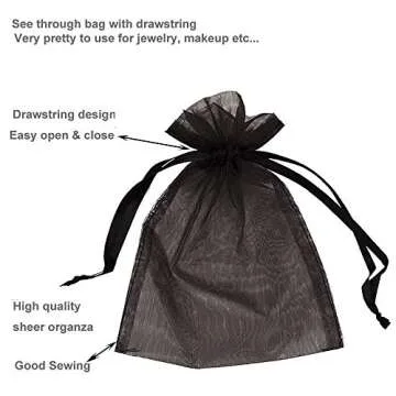 Show moreUnleash the charm and elegance of your gifts with the LPHUMEX 100PCS Black Organza Bags. Designed with a perfect balance of style and functionality, these 4x6 inch drawstring pouches are crafted to elevate any occasion. The sheer black organza material not only adds a chic and luxurious touch to your gifts but also allows a hint of the enclosed treasures to peek through elegantly. Ideal for containing jewelry, beauty products, or even wedding favors, these bags are versatile enough to meet numerous gifting needs.