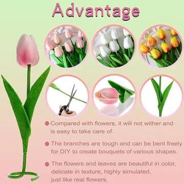 When compared to similar products in the market, the **Lpluziyyds Artificial Tulips** distinctly stand out due to their premium PU material, which evokes realism that synthetic plastic simply cannot match. While others may use cheaper alternatives that may fade over time, our tulips maintain vibrant colors and a lifelike look. Additionally, the flexibility of the steel wire stems allows for easy customization, giving users the ability to create unique arrangements tailored to their decor needs.