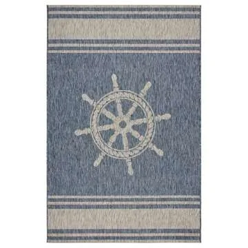 Show more Transform your outdoor experience with the LR Home Captiva 5 x 7 Indoor/Outdoor Area Rug. Expertly designed and crafted in Turkey, this power-loomed rug doubles as a stylish addition to your living spaces while standing resilient against the elements and daily wear. Made from 100% polypropylene, this rug is specifically engineered to endure fading, staining, and moisture, making it a perfect fit for high-traffic areas. Available in an inviting denim blue and gray, it seamlessly integrates a touch of nautical charm into your decor.