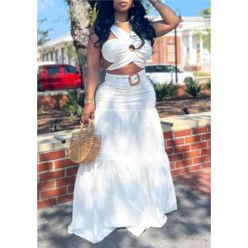 LROSEY Women's 2 Piece Sexy Outfits Summer Flower Shape Sleeveless Crop Top Ruched Ruffle Maxi Skirt Set for Party Club Night White