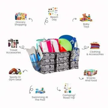 Lucazzi Extra Large Utility Tote Bag - Oversized Collapsible Reusable Wire Frame Rectangular Canvas Basket With Two Exterior Pockets For Beach, Pool, Laundry, Car Trunk, Storage - Elephant Black
