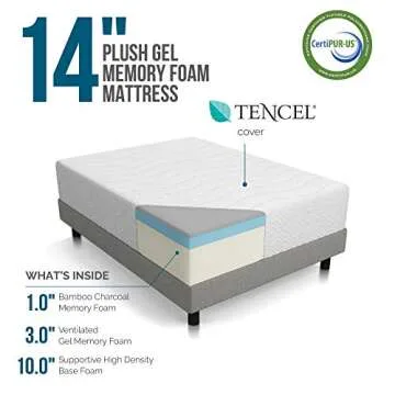 Show moreIntroducing the LUCID 14 Inch Memory Foam Bed Mattress, a perfect blend of luxury and support crafted for the ultimate sleeping experience. This exceptional mattress features a dual-layer design with two memory foam layers that effortlessly conform to your body's unique contours. The top layer is a 1-inch bamboo charcoal memory foam that is expertly quilted into a soft Tencel blend cover, ensuring you enjoy a gentle touch while experiencing the benefits of charcoal's natural properties. The core is made of supportive memory foam that cradles your body for a truly restful night.