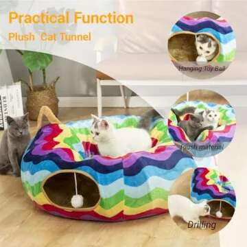 LUCKITTY Large Cat Tunnel Bed with Plush Cover,Fluffy Toy Balls, Small Cushion and Flexible Design- 10 inch Diameter, 3 ft Length- Great for Cats, and Small Dogs, Rainbow Wave Color