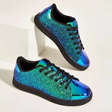 Show moreStep into a world of sparkle and style with the LUCKY STEP Glitter Sneakers Lace Up. Ideal for those who wish to elevate their footwear game, these fashion sneakers combine chic aesthetics with high functionality. Made from a dynamic blend of glitter, PU, and TPR sole, these shoes not only catch the eye but also ensure long-lasting comfort and durability. The green hologram finish adds an enchanting twist to your wardrobe, making every step you take truly remarkable. Enjoy the elegance of height without the discomfort of heels, as these sparkly sneakers stand out while keeping you grounded.