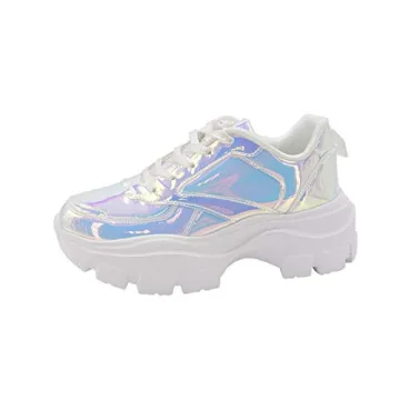 Show more Elevate your footwear game with the LUCKY STEP Women 90S Chunky Platform Reflective Sneakers, where retro charm meets contemporary style. Designed for fashion-forward individuals, these sneakers combine lightweight materials with a wide toe box and cushioned ankle support to ensure unparalleled comfort throughout your day. Whether you're rushing up four flights of stairs to teach a dance class or enjoying a casual day out, these shoes have been praised for their remarkable ease of wear. Their 2.36-inch chunky heel provides a distinct lift that flatters any outfit, while the stunning White Hologram color reflects light beautifully, making your ensemble pop as the sun goes down.
