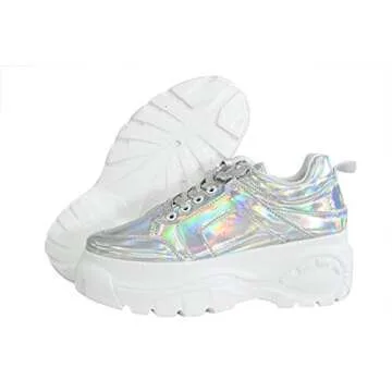 LUCKY STEP Women Chunky Platform Dad Colorblock White Neon Green Fuchsia Hologram Silver Casual Lace-Up Walking Sneakers (10 B(M) US, Hologram Silver)
