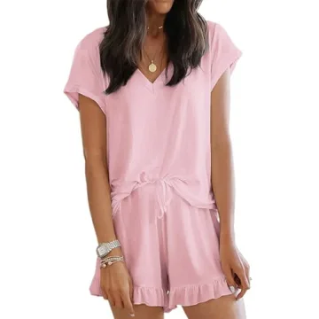 Featuring a chic V-neck design and short sleeves, this set ensures you remain stylish at all times without sacrificing your comfort. The relaxed fit accommodates all body types, allowing room for movement while maintaining a flattering silhouette. The shorts, designed with an elastic waist and drawstring, provide an adjustable fit, and their dual pockets add a touch of practicality, perfect for stashing away small necessities like your phone or lip balm. With delightful ruffles adding a touch of whimsy, you'll look and feel fabulous!