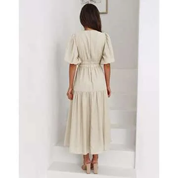 Show moreIntroducing the Lucrosun Women's Summer V Neck Short Puff Sleeve A Line Tiered Midi Dress, the ultimate attire for sunny days and special occasions! Crafted with a light, breathable fabric, this dress promises comfort while keeping your style in check. The flattering V-neck design and chic puff sleeves enhance your feminine silhouette, making it perfect for everything from backyard barbecues to romantic date nights. Available in a beautiful apricot shade, it complements a variety of skin tones and easily transitions from day to night.