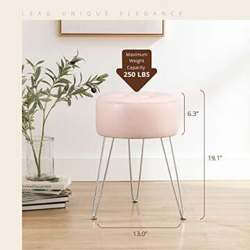 Show moreIntroducing the LUE BONA Faux Leather Vanity Stool Chair, your perfect companion for a stylish makeup room or vanity space. This chic small round stool brings a pop of color with its delightful pink faux leather upholstery, making it a beautiful accent piece that enhances any decor style. Designed to blend modern aesthetics with functionality, this 19-inch high stool features an elegant tufted seat that invites comfort while you perfect your look or enjoy a quick touch-up. With sturdy metal legs providing exceptional stability, you’re not just investing in beauty, but also durability.