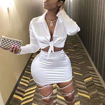 LuFeng Womens Satin Sexy Self Tie Front Long Sleeve 2 Piece Outfits Crop Top and Mini Bodycon Skirt Set