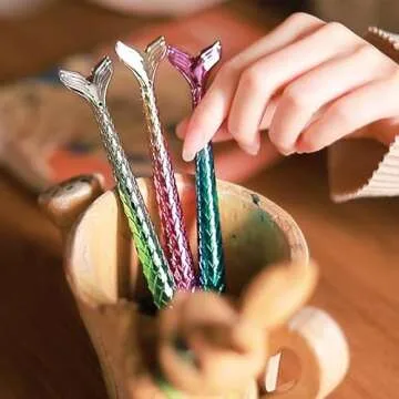 Show more Introducing the enchanting Mermaid Pens – a delightful writing instrument that combines functionality with whimsical artistry. Each pen is designed with an exquisite fish tail motif, showcasing clear lines and vibrant colors that make them truly stand out. Craftsmanship is evident in every detail, from the protective cap for the nib to the rich hues that adorn these writing tools. Perfect for anyone who appreciates beauty in the everyday, these pens are not just practical but also a conversation starter.