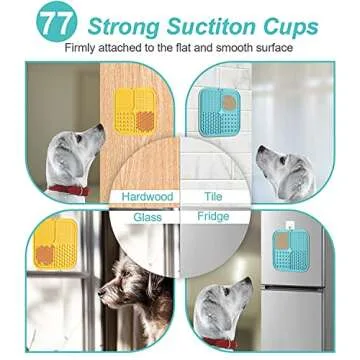 The licking mat has 77 powerful suction cups that adhere firmly to wooden, tile, glass surfaces, and even refrigerators.