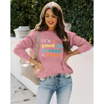 LUKYCILD It’s a Good Day to Read a Book Sweatshirt Women Book Lovers Teacher Shirt Funny Graphic Print Long Sleeve Top Pink